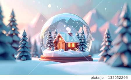 A wooden staircase leads through a snowy landscape surrounded by pine trees. A cabin is visible in the background, creating a serene countryside atmosphere.