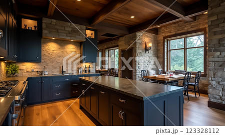 Modern kitchen with stone accents and warm lighting in a cozy cabin setting near the forest