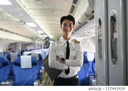 Portrait of smiling pilot standing with his arms crossed in the aisle of an airplane