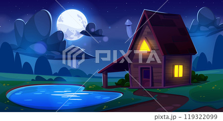 Cabin in night forest. Cartoon house with glowing windows or lamp in mystic dark wood. Nighttime panorama. Fairy tale cottage in mysterious woodland. Fantasy landscape. Vector illustration