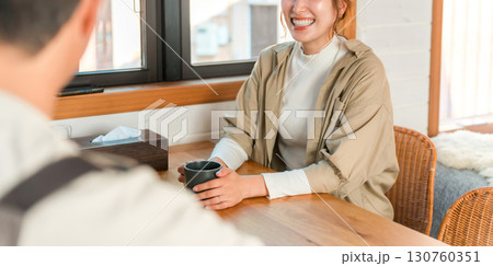 一對夫婦在小屋、小木屋或木屋裡邊喝咖啡邊微笑和交談