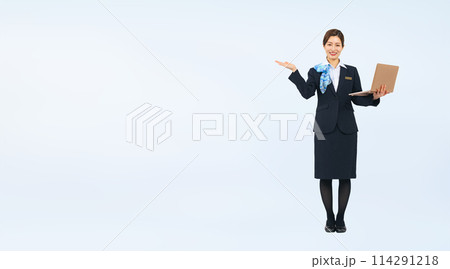 一位客戶服務業女性手持筆記型電腦引導人們的全身照片