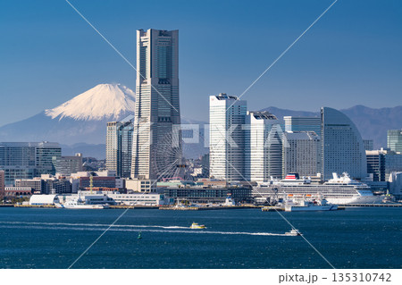 日本橫濱市景,包括飛鳥三號、富士山、關內町和港口未來。新高島位於右側背景。