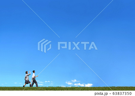肩並肩走反對藍天的兩名男人和婦女。高考,錄取,職業形象