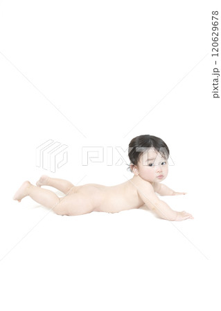 白色背景中爬行嬰兒看著相機的全身側視圖