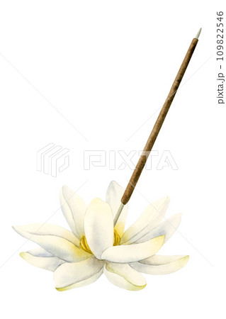 Lotus flower aroma stick stand watercolor illustration isolated on white background. Indian incense stick holder for spa salons designs. Burner for aromatherapy and meditation