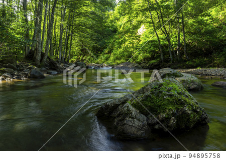 清澈的山間溪流蜿蜒流過長滿青苔的大岩石