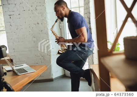African-american musician playing saxophone during online concert at home isolated and quarantined, impressive improvising
