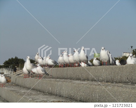 成群的黑頭鷗聚集在凱見川海灘的海堤上