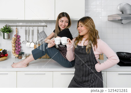 Two women with a striped apron drink coffee from mug while standing in front of counter in a modern kitchen.