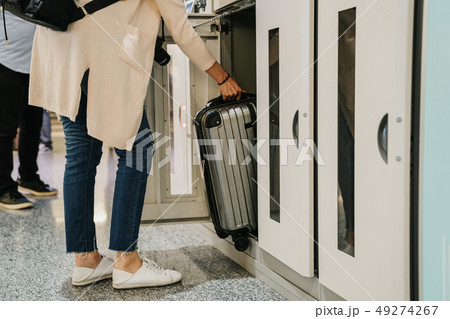 Young asian attractive woman travel by airplane, Passenger wearing headphone putting hand baggage in lockers above seats of plane.