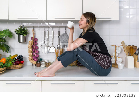 Young asian woman with a striped apron drink coffee from mug while sitting on counter in a modern kitchen. Cooking utensil and an assortment of decorated fruit and vegetable are on the countertop.