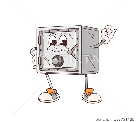 Cartoon retro groovy strongbox safe vault character with smiling face, arms and legs. Isolated vector steel and sturdy box hippie personage guards secrets and money inside with a jovial demeanor