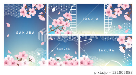 藍天下櫻花盛開、花瓣飄揚的春天景象