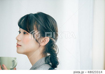 傾斜在窗口的一個人由有杯子的手