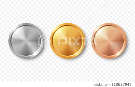 Vector 3d Realistic Blank Golden, Silver and Bronze Award Medal Set, Closeup, Isolated. Design Template for Certificates, Awards. Front View