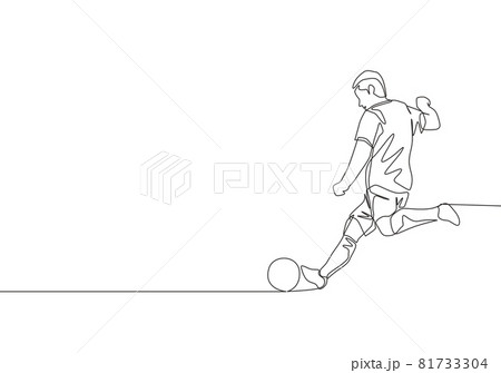 One single line drawing of young energetic football player dribbling the ball and ready to shot to the goal. Soccer match sports concept. Continuous line draw design vector illustration