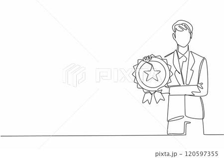 Continuous one line drawing man in blazer and tie holding medal emblem. Very successful. Very prestigious career level. Award. Employee Appreciation Day. Single line draw design vector illustration