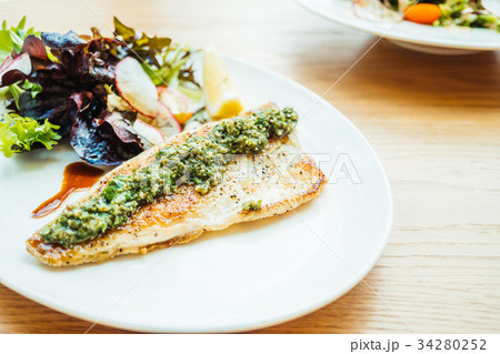 Roasted dorada fillet in creamy sauce with baked vegetables and lemon