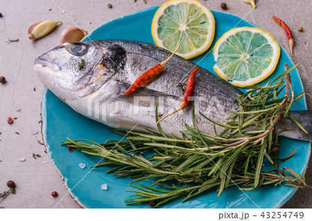 Raw dorado fish with spices cooking on cutting board. Fresh fish dorado