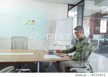 Smiling asian businessman sitting in meeting room using laptop seen through glass wall