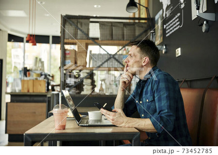 Man seated in a cafe using a laptop, wearing headphones, taking an online call.