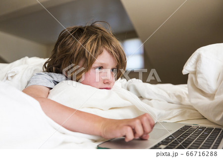 6 year old boy looking at laptop compuetr in his bedroom