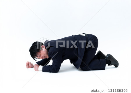 一幅簡單的插圖,描繪了一位商人絕望地蹲伏著的情景。商業場景。
