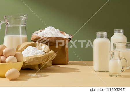 A front view presenting essential cooking or baking ingredients include milk, butter and eggs - neatly arranged on a kitchen counter. Cooking concept for designing