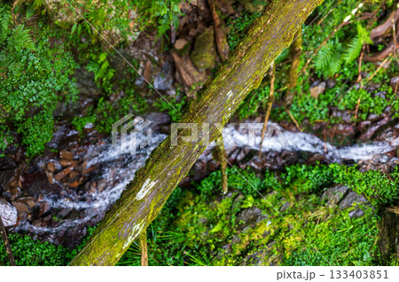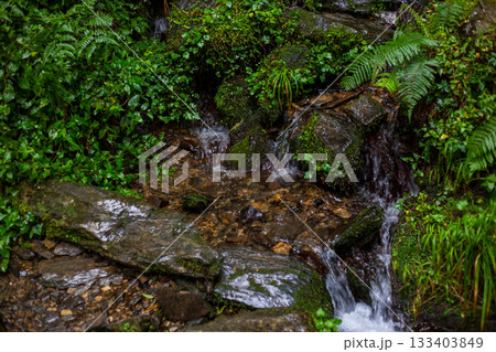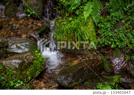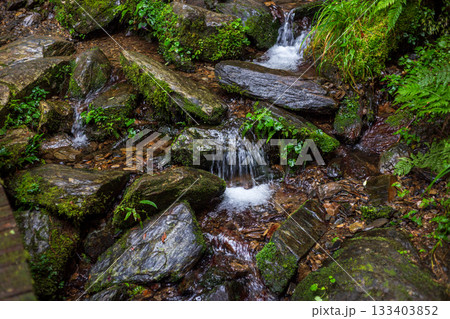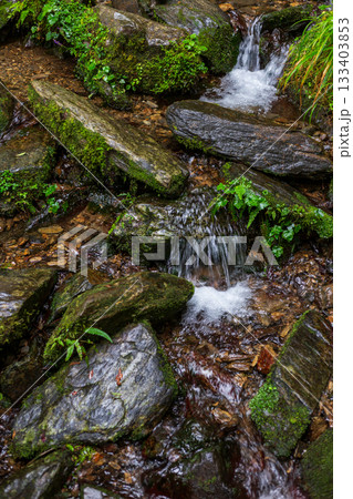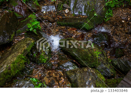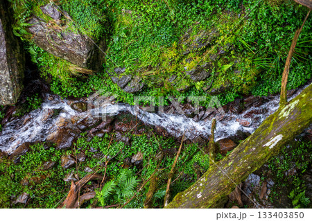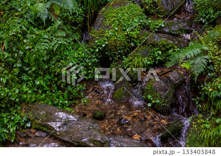 宜蘭森林中流經佈滿青苔岩石的清澈山澗