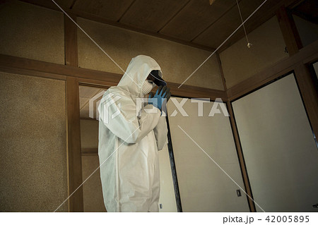 Man with protective mask explores danger area.