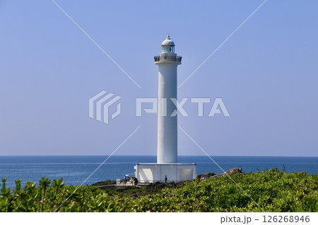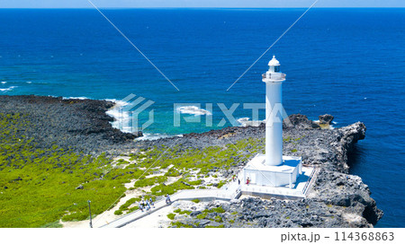 沖繩縣中神郡讀谷村宇座:白堊色的殘波岬燈塔矗立在殘波岬的頂端,懸崖下是蔚藍的大海。