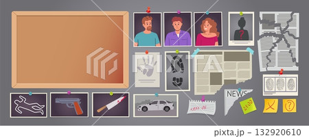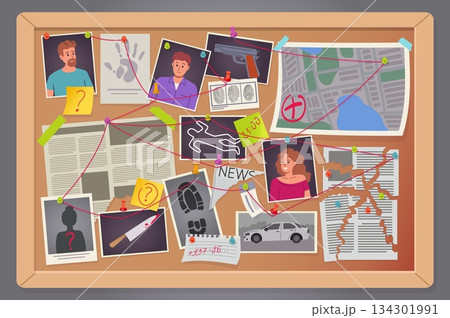 Investigation board. Homicide detectives board showing clues and suspects, a crime scene map, weapon, vehicle and notes. Vector illustration.