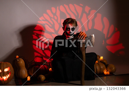 3d halloween day concept with cute ghost holding a bloody knife isolated. holiday party, 3d render illustration