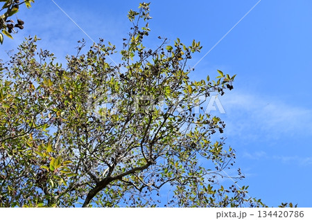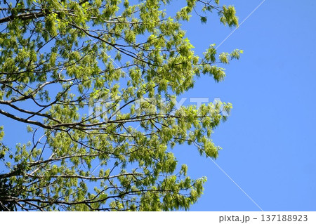 長滿嫩葉和花朵的橡樹枝梢(神田公園的藍天和橡樹)