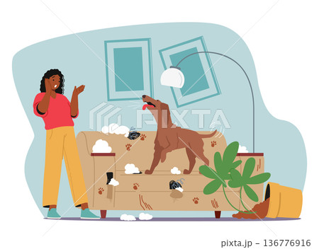 Anxious Female Owner and Dog Damaged Sofa, Visual Representation Of Behavior Problems In Pets, Vector Illustration