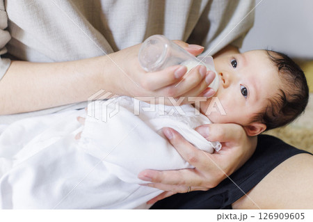 亞洲嬰兒從嬰兒奶瓶裡喝牛奶