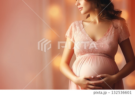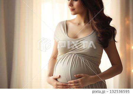 Anticipation of Motherhood Copy Space Featuring a Radiant Pregnant Woman Standing, Embracing the Journey to Motherhood with Grace. created with Generative AI