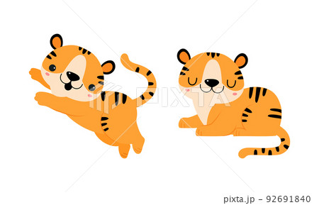 Cute Little Striped Tiger Cub with Orange Fur Sitting and Leaping Vector Set