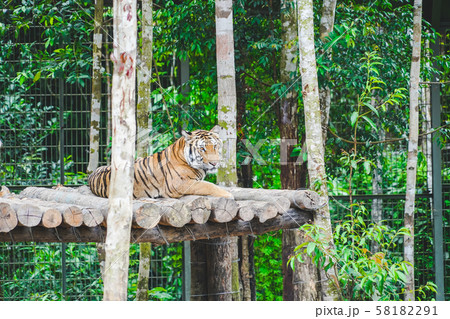a wild tiger taking rest on the tree in the jungle. a big cat sitting on fence in the zoo.