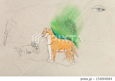 children unfinished drawing - tigress with cubs
