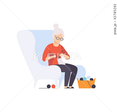 Senior woman character sitting in armchair and knitting, elderly people leading an active lifestyle