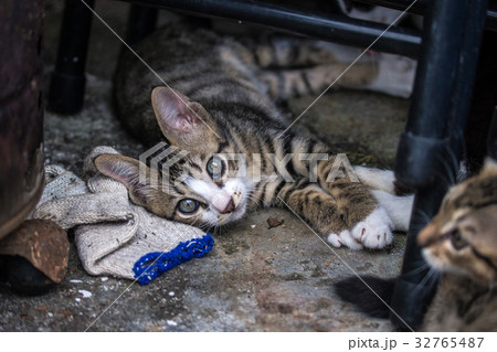 A happy kitten enjoys being petted by a woman's hand. A beautiful little kitten sits in the arms of a girl in a yellow dress.