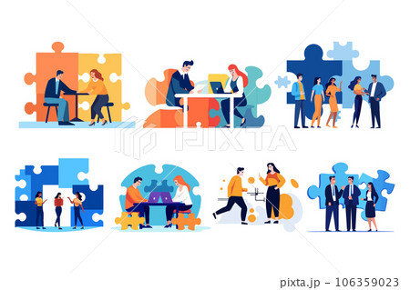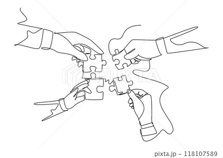 Continuous one line drawing of business team members unite puzzle pieces together to one as team building symbol. Office employee teamwork concept. Single line draw design vector graphic illustration