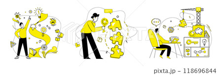 Puzzles interconnected above a person at a desk with a laptop and an arrow points upward. Ideal for themes of problem-solving, growth, strategy, focus, innovation, productivity, success. Line