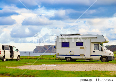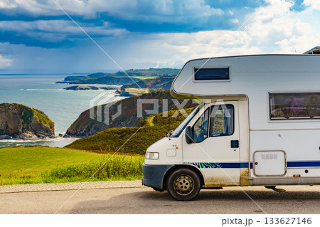 Camper vans on Verdicio beach, Asturias coast in Spain.