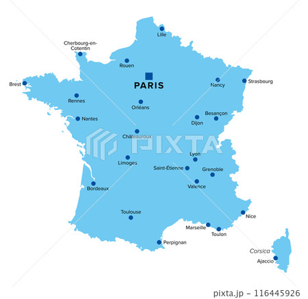 Metropolitan France silhouette, political map with capital Paris and large cities. Area of European France, geographically in Europe, compromising the mainland, Corsica and nearby French islands.