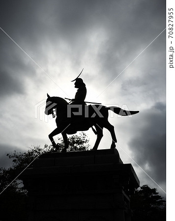 日期Masamune騎馬雕像仙台城堡廢墟