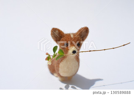 毛氈羊毛狗拿著一朵 Symphoricarupos 花
