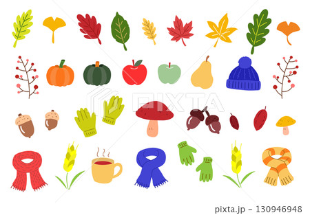 秋季物品套裝插圖(南瓜、落葉、橡實、圍巾等)